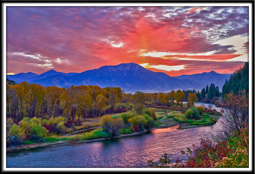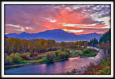 I planned to look for some good autumn foliage along the south fork of the Snake River this morning. Just after 5:00 am, I received a wrong number phone call from L.A. which put me a bit ahead of schedule. I found a good spot on the south side of the river in Swan Valley before the sun hit the horizon, and then for a few seconds was treated to some gorgeous color.